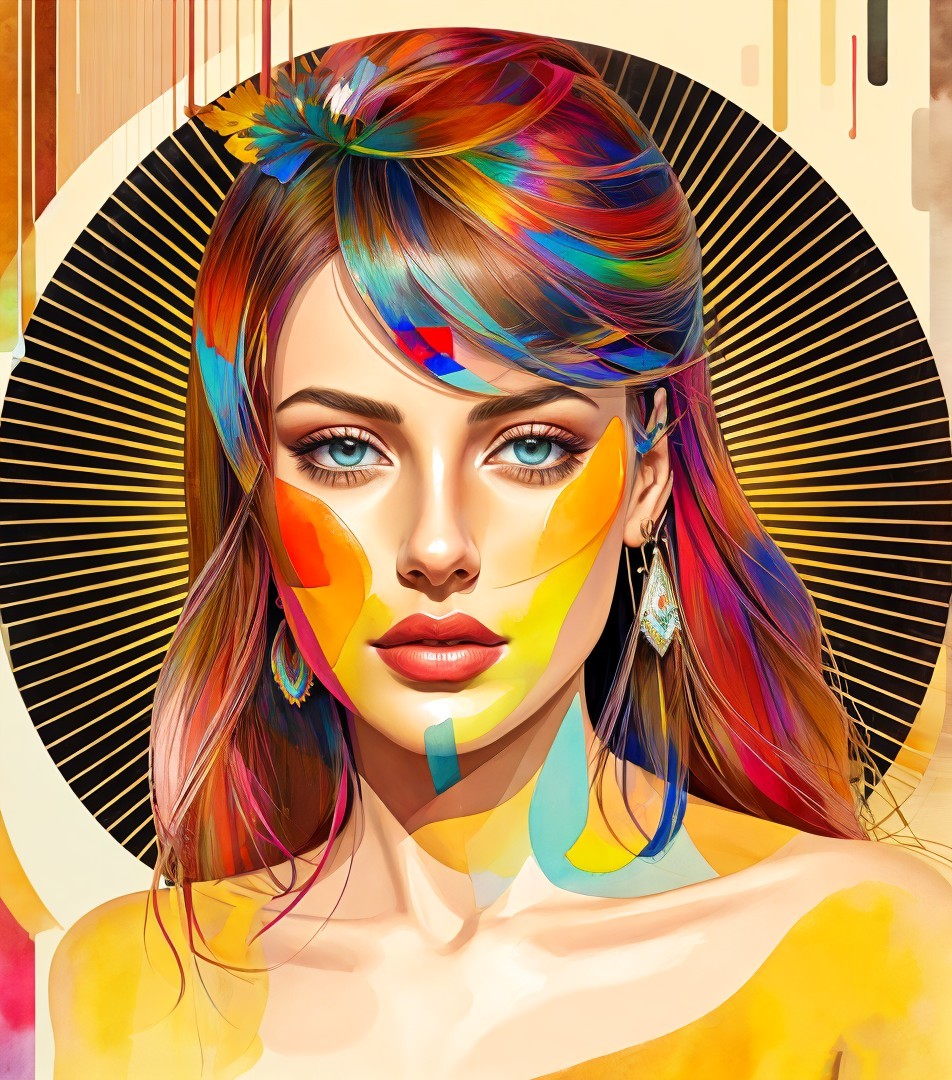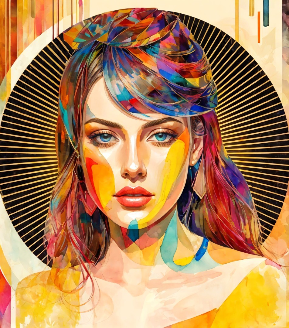 + Prompt:Abstract portraiture in gouache merged with watercolor, beautiful female face, symmetrical & chiseled, facial features, multi-textured, geometrical layered vector art, assemblage, bas relief & sketch art elements, Perfect Proportional Anatomy, dark metal paints, aesthetic integrity of lines & shapes, aesthetically beautiful, symmetrical & chiseled facial features, Color palette is rich earth toned colors, ochre, silver, grays, chrome & graphite, highly colored and designed patchwork in fabric textiles, divisionism, 32K, UHD, HDR, HQ, hues in metal paints, integrity of lines & shapes, Color palette is rich jewel toned colors, black, silver, grays, chrome & graphite Surreal natural elements Richly colored and designed patchwork in textiles & background, Structured minimal divisionism, overall stylized illustration by H. J. Ward and FrankMcCarthy,