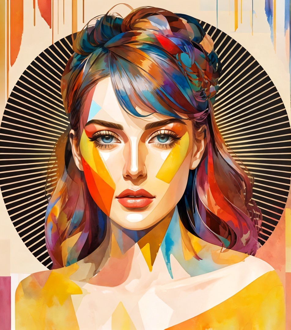 Colorful, geometric portrait of a woman with striking eyes and abstract patterns.