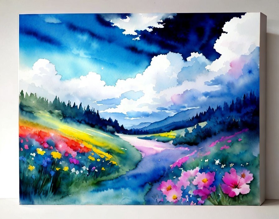 A vibrant watercolor painting of a lush landscape with a path through fields of colorful flowers and blue, cloud-streaked skies.
