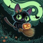 A cute black cat wearing a witch's hat sits on a carved pumpkin, surrounded by bats and a full moon. Text reads "Halloween is Coming," evoking a festive autumn vibe.