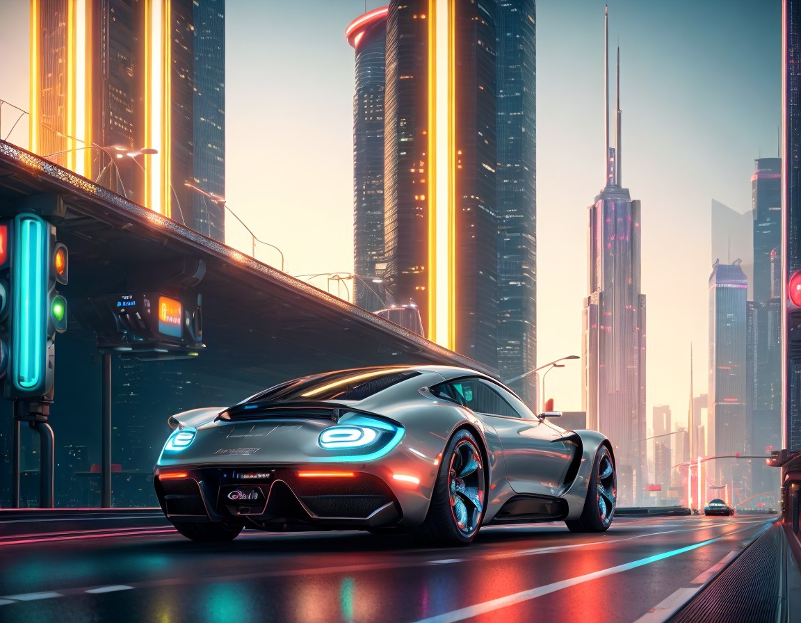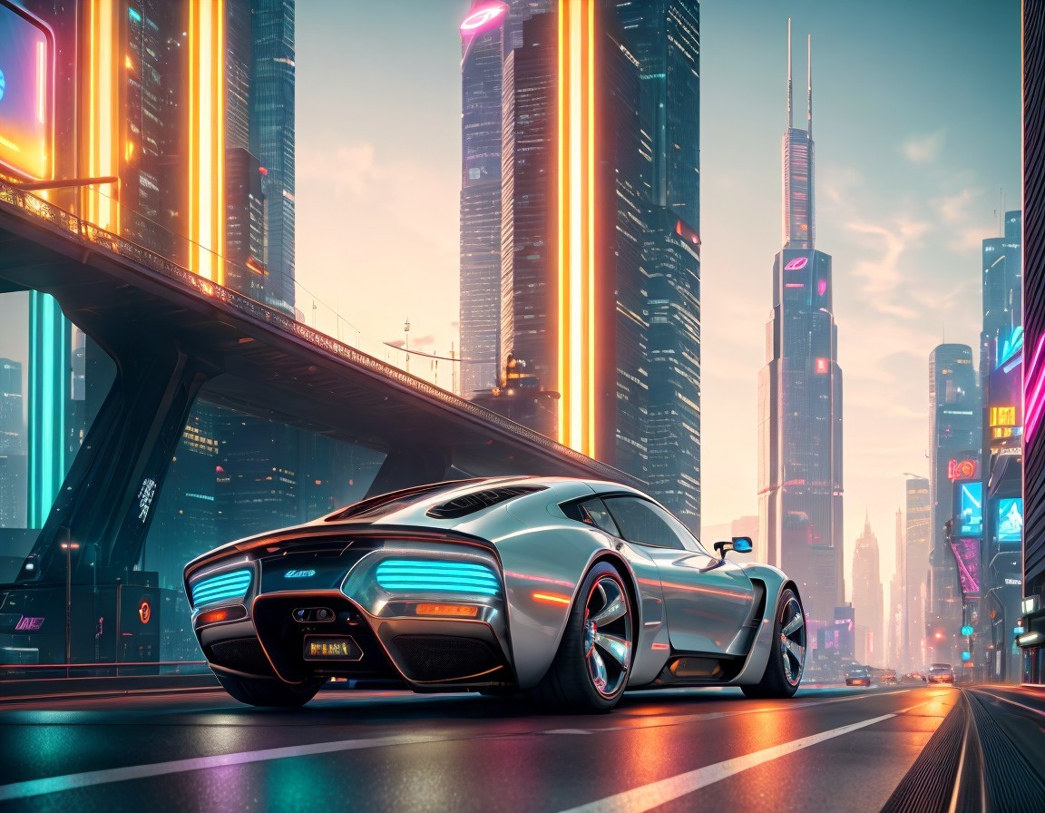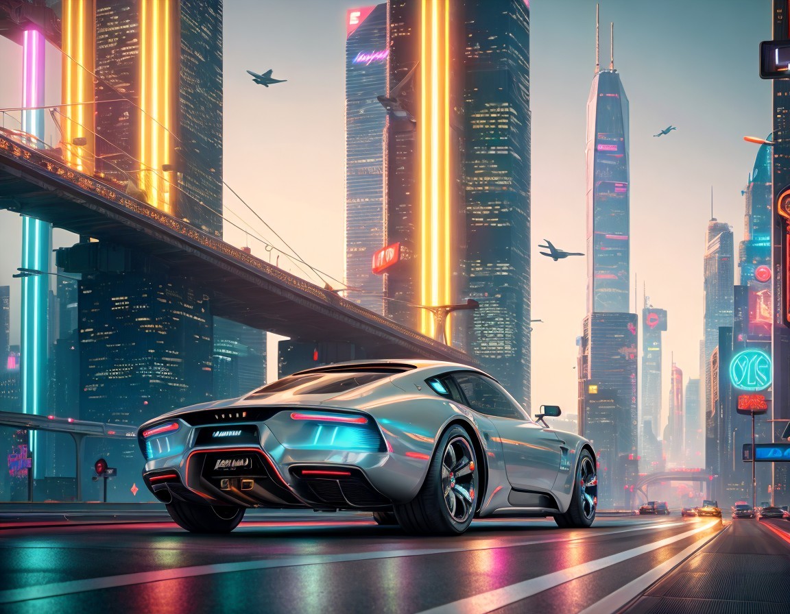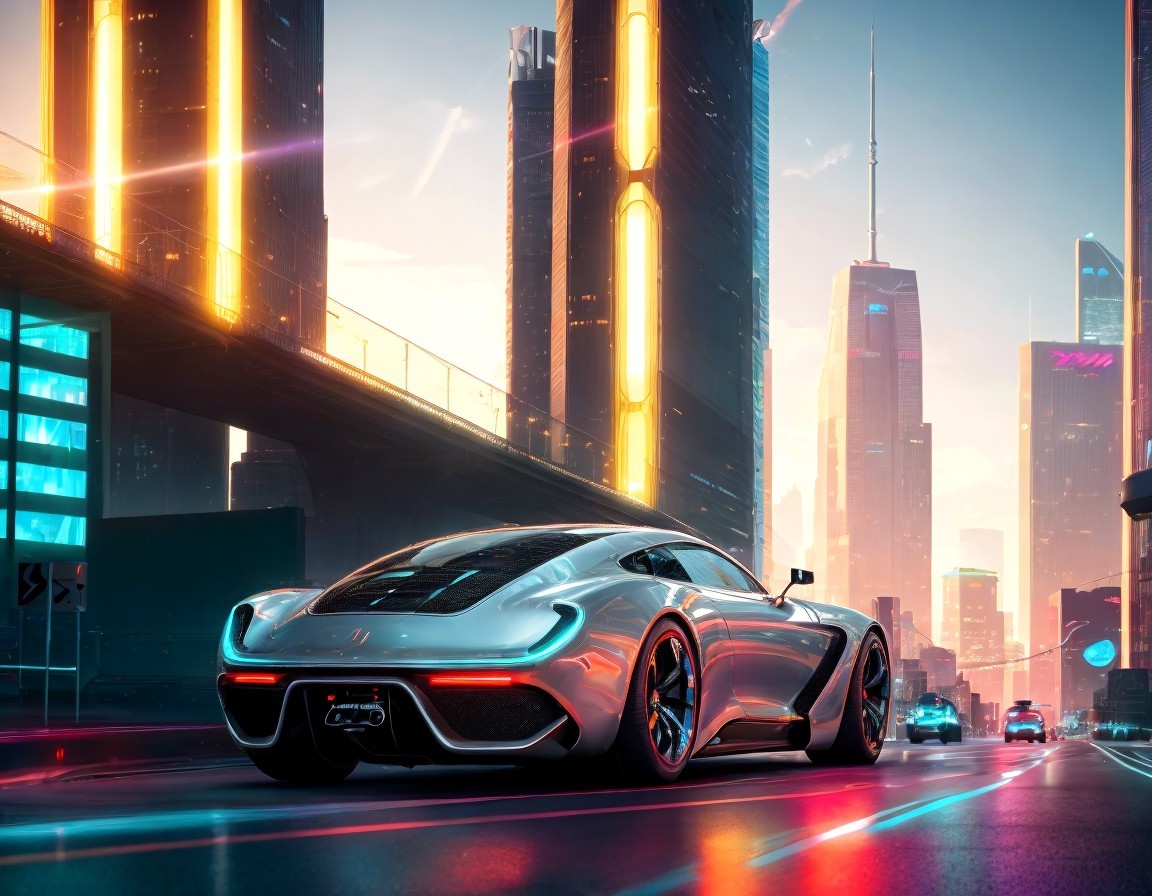 Prompt: "Vintage design with a futuristic twist, sleek aerodynamic curves, retro chrome accents, advanced technology integration, holographic dashboard display, neon lights, glossy metallic finish, urban setting with skyscrapers, flying vehicles in the background, digital billboards, bustling futuristic cityscape, elevated highways, robotic pedestrians, dynamic angles, high resolution for intricate details, vibrant color palette of silver, chrome, neon blue, and black, artificial lighting creating a cyberpunk ambiance."