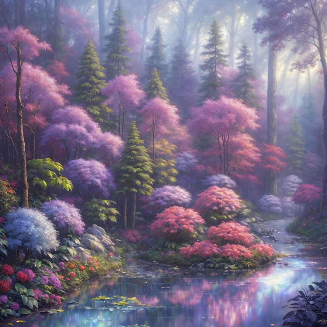 A serene forest scene featuring vibrant pink and purple foliage, softly illuminated by gentle light filtering through mist. A tranquil stream reflects the colorful vegetation, enhancing the ethereal atmosphere.