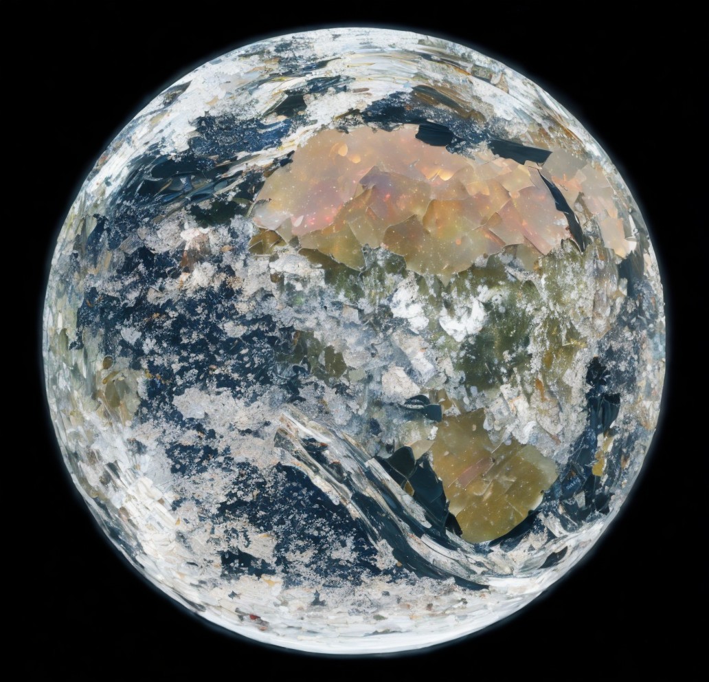 A surreal crystal sphere featuring an apple partially submerged in a reflective surface. The vibrant colors of the apple contrast with dark, flowing liquid, creating an intriguing visual effect.