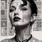 A stunning black-and-white portrait of a woman with intricate tattoos and striking golden eyes. She wears bold makeup, elegant earrings, and a decorative necklace, set against patterned backgrounds.