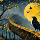 A surreal illustration features a black crow perched on a yellow bridge, with another crow flying in the background against a textured blue sky and a large, glowing yellow moon.