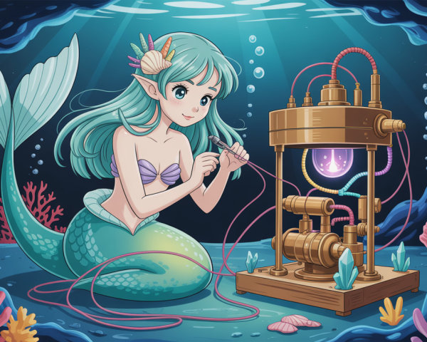 A charming anime girl showcases a playful chicken-kiev-themed swimsuit, featuring vibrant colors and fun patterns. Her cheerful expression and lively pose add to the whimsical charm of the design.