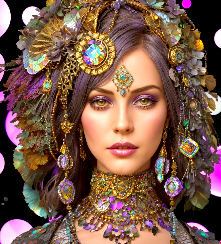 Fantasy Portraiture, junk art style, cottagegore with glass trails and scales around female face, ornamental details, mosaic patterns, highly chipped ,all made of beads, shiny aura, highly detailed, luminescent filigree by Margaret Keane, glowing stardust, by Ho baron, perfect composition, smooth, sharp focus, sparkling particles, lively gold particles
