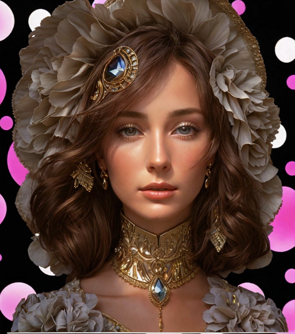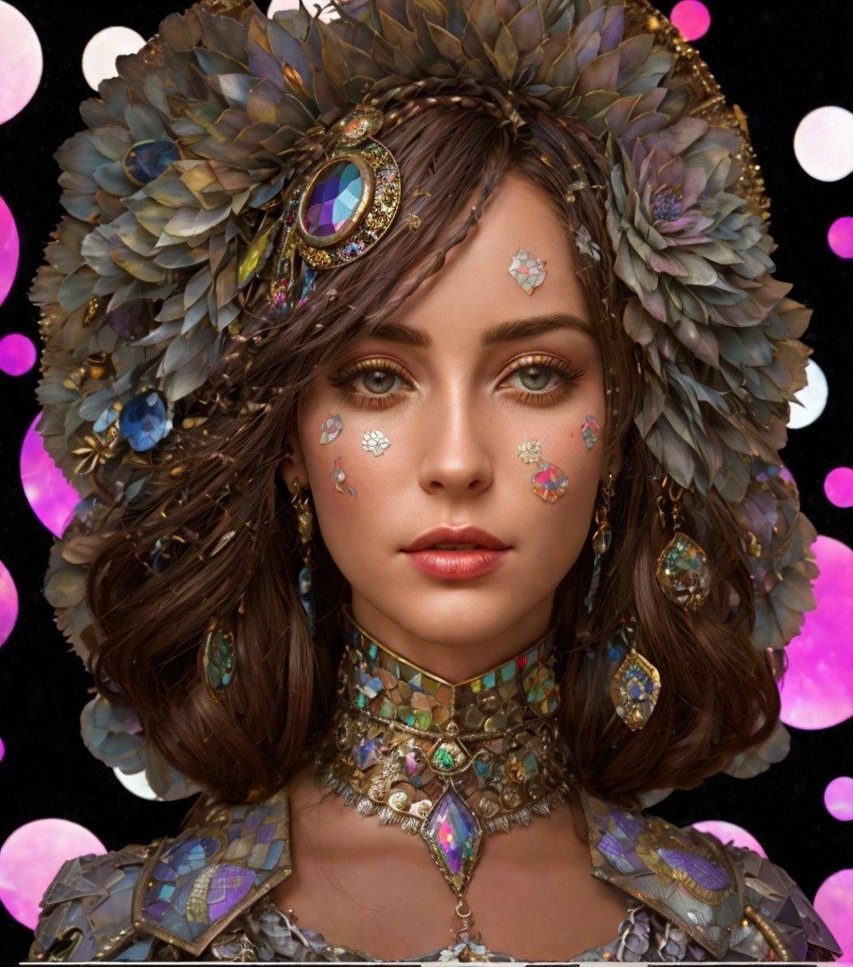 Prompt: Fantasy Portraiture, junk art style, cottagegore with glass trails and scales around female face, ornamental details, mosaic patterns, highly chipped ,all made of beads, shiny aura, highly detailed, luminescent filigree by Margaret Keane, glowing stardust, by Ho baron, perfect composition, smooth, sharp focus, sparkling particles, lively gold particles