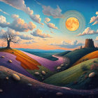 Vibrant rolling hills in a surreal landscape, featuring purple and green terrain under a dramatic sky. A large, glowing moon hovers above, casting ethereal light on a distant rock formation.