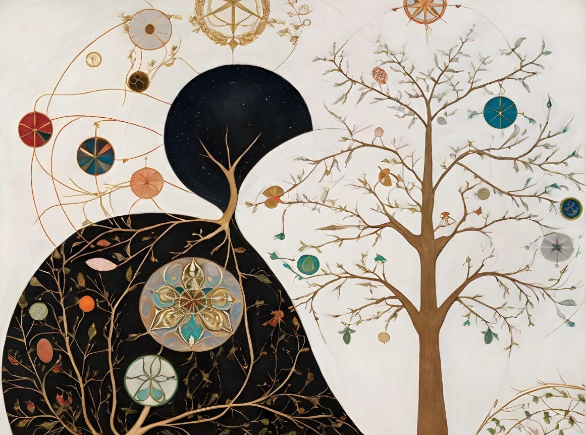 A stylized painting depicting a tree with celestial bodies and circular motifs representing the cosmos, blending nature with the universe.