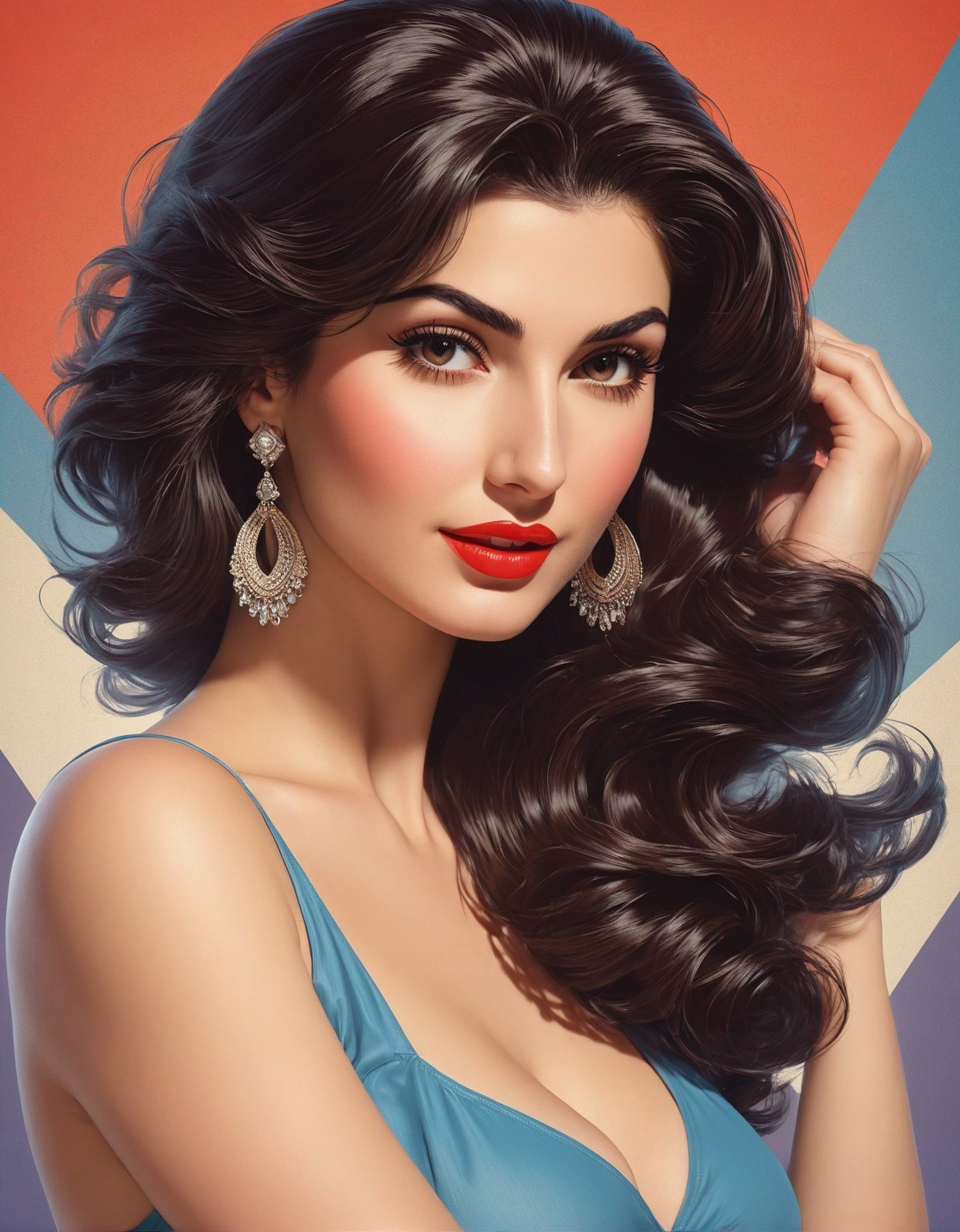 Illustration of a woman with voluminous hair, red lipstick, and earrings, against a geometric background.