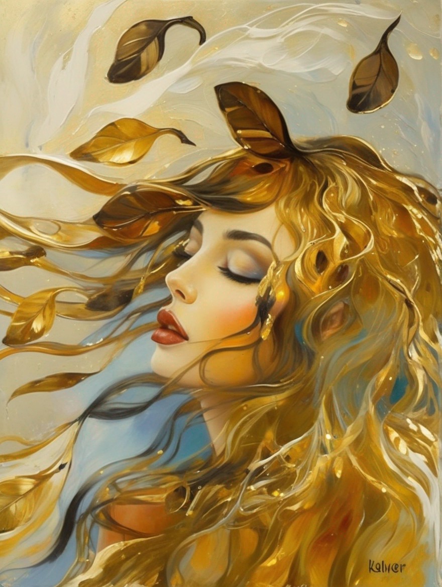 A digital painting of a woman with golden hair and leaves flowing around her, evoking an autumnal, ethereal feel.
