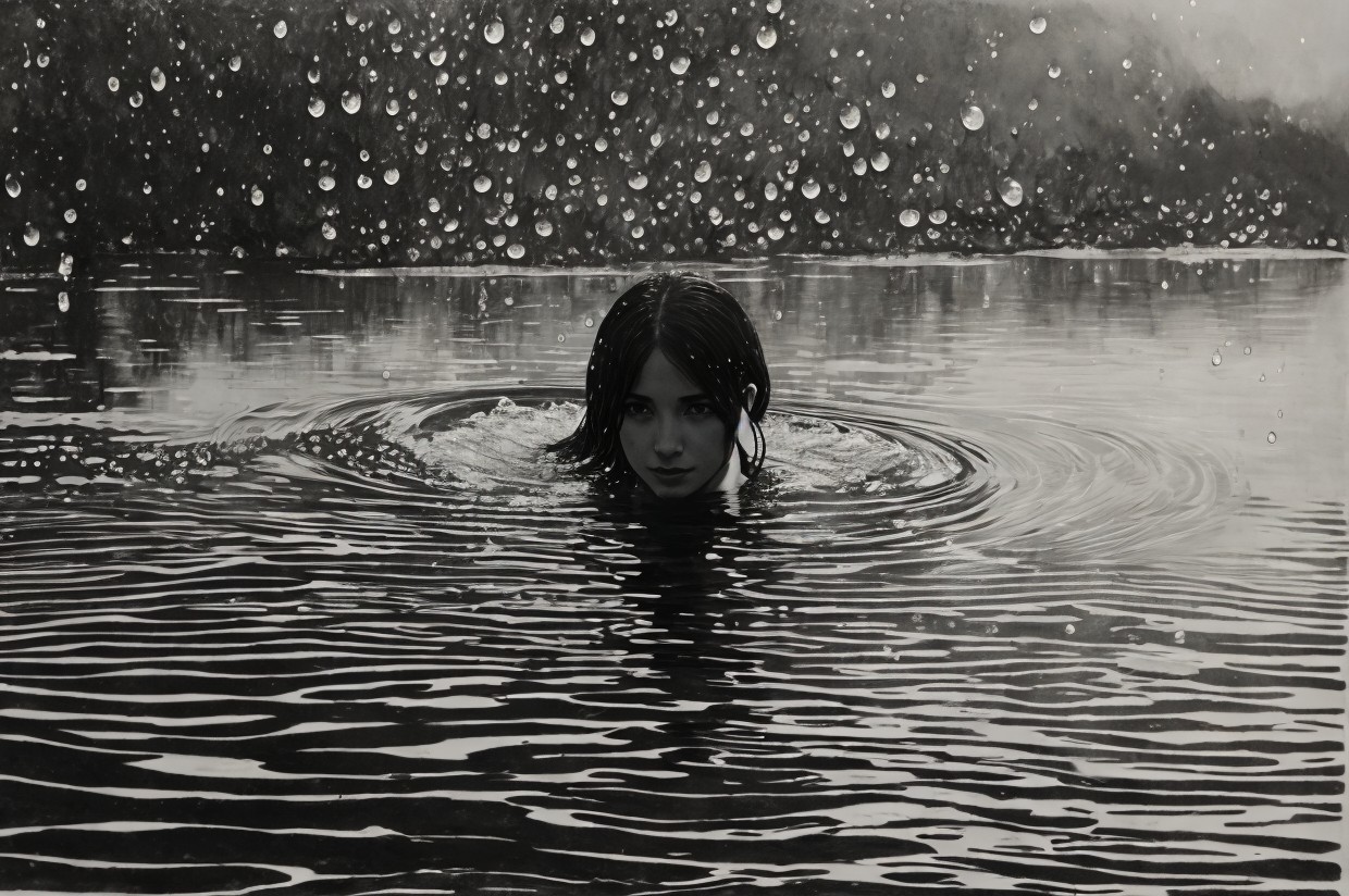A monochromatic image of a woman submerged in water up to her neck, with ripples around her and raindrops creating patterns on the surface.