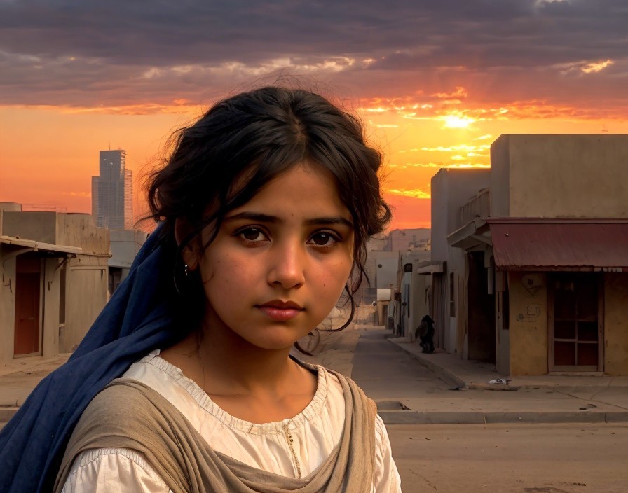 Spectacular sunrise shining on the face of homeless, starving, beautiful young immigrant woman, standing in a desolate El Paso street, with buildings in a variety of desaturated colors, by Bouguereau