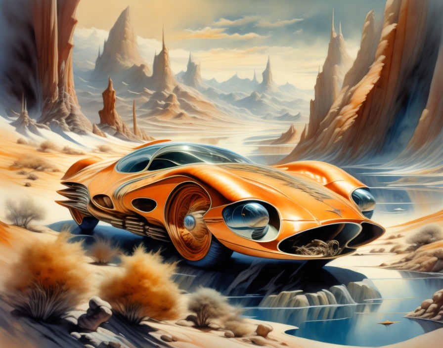 A futuristic orange car with a sleek design on an alien desert landscape with red sands and towering spires under a blue sky.