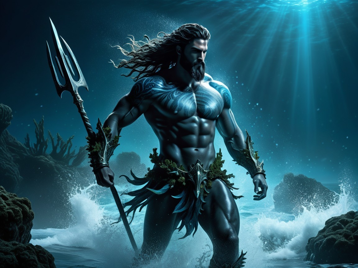 A powerful, muscular warrior stands amidst crashing waves, brandishing a trident. His long hair flows in the ocean breeze, adorned with seaweed, embodying a fierce connection to the sea.