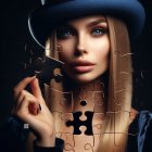 A close-up portrait of a woman with striking blue eyes, bold blue eyeshadow, and glossy red lips. She has radiant skin and her wavy hair is elegantly styled, complemented by a fashionable hat.
