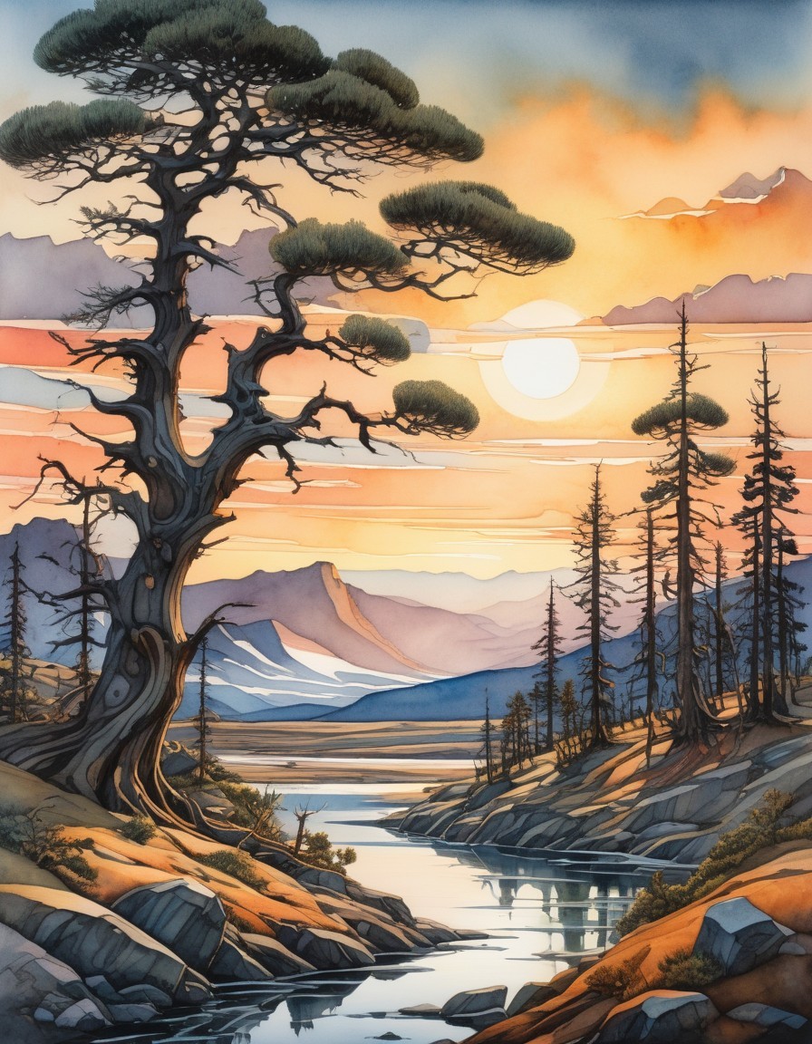Create lots of distortion, exaggerated shapes and textures. Create a detailed, surreal watercolor painting of a river winding through an Arctic tundra landscape, featuring gnarly scrub pines and misshapen dead pines, with sun setting over mountains in the distance. Style of a warped version of Ivan Bilibin, Brian Froud, and Eyvind Earle, Dali and Tim Burton .