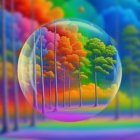 A vibrant bubble encases a colorful forest with trees in shades of green, orange, and yellow, set against a dreamy, blurred background of blues and purples, evoking a whimsical, serene atmosphere.