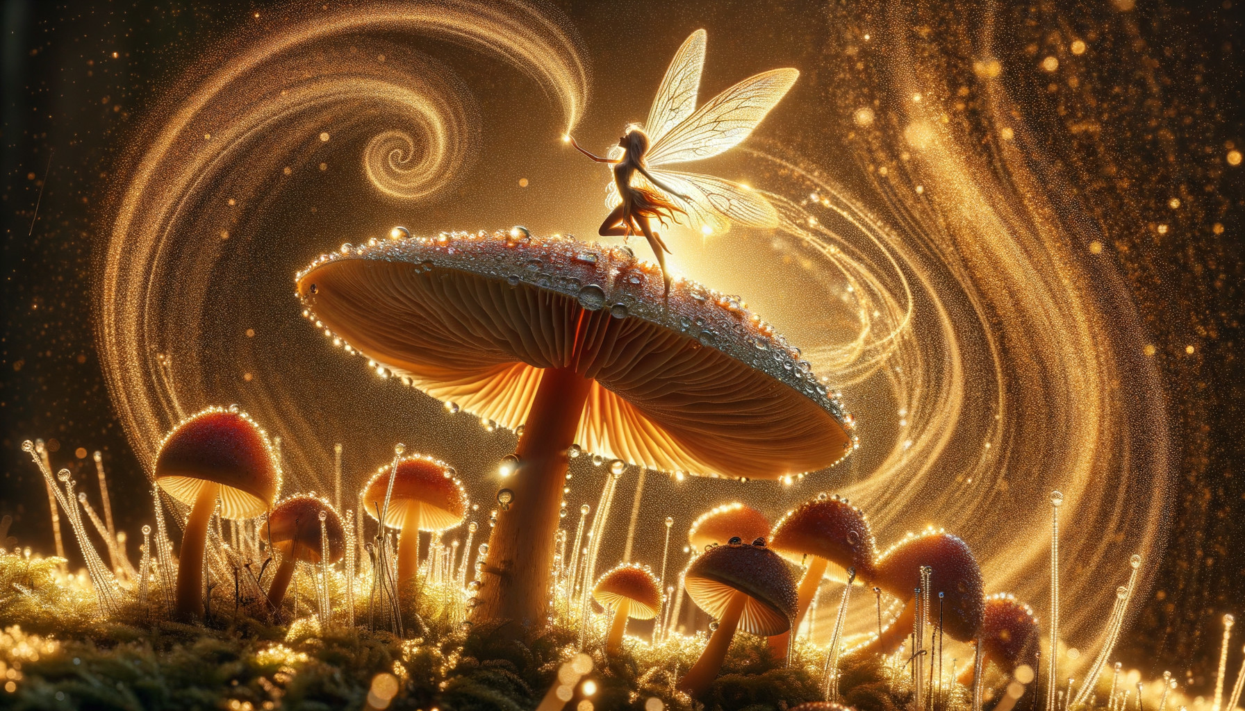A mystical fairy stands atop a dew-covered mushroom surrounded by glowing lights and smaller mushrooms against a swirling golden backdrop.