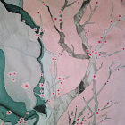A delicate cherry blossom tree is depicted with twisting branches adorned in pink and white flowers. The soft background enhances the serene beauty of this artistic nature scene.
