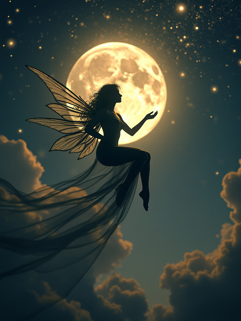 (Try from Adi) - A silhouetted fairy with delicate wings floats against a backdrop of a glowing moon and stars, draped in flowing garments.