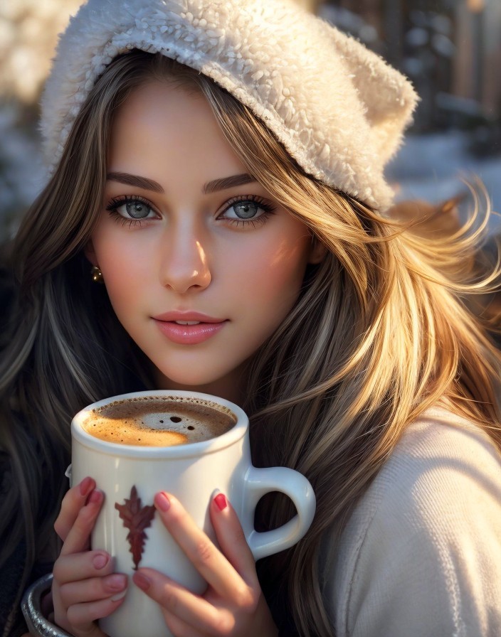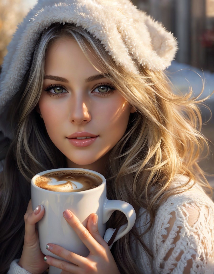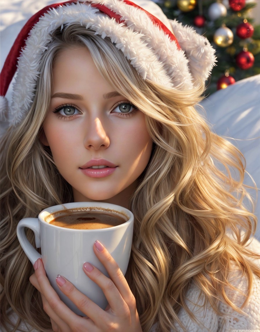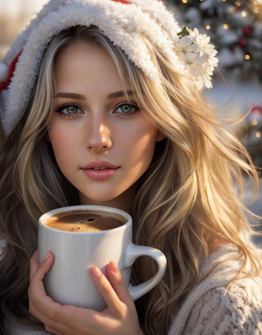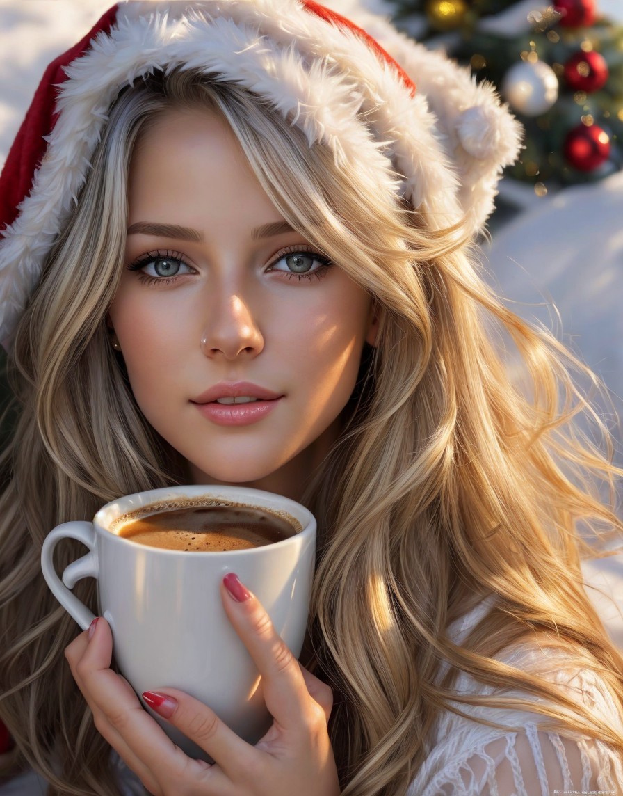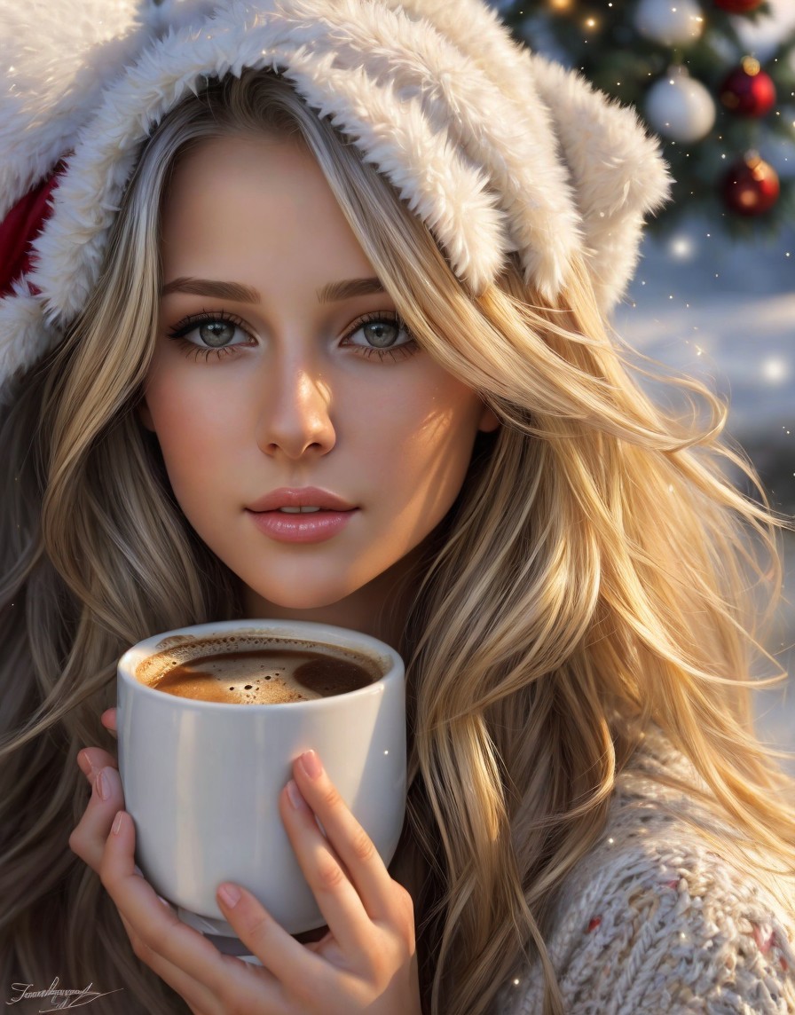 Prompt: "Christmas Morning coffee in November + Hansom a sixteen-year-old blonde girl with gray eyes looking at you, style of Yossi Kotler, Steve Hanks and Andrew Atroshenko"