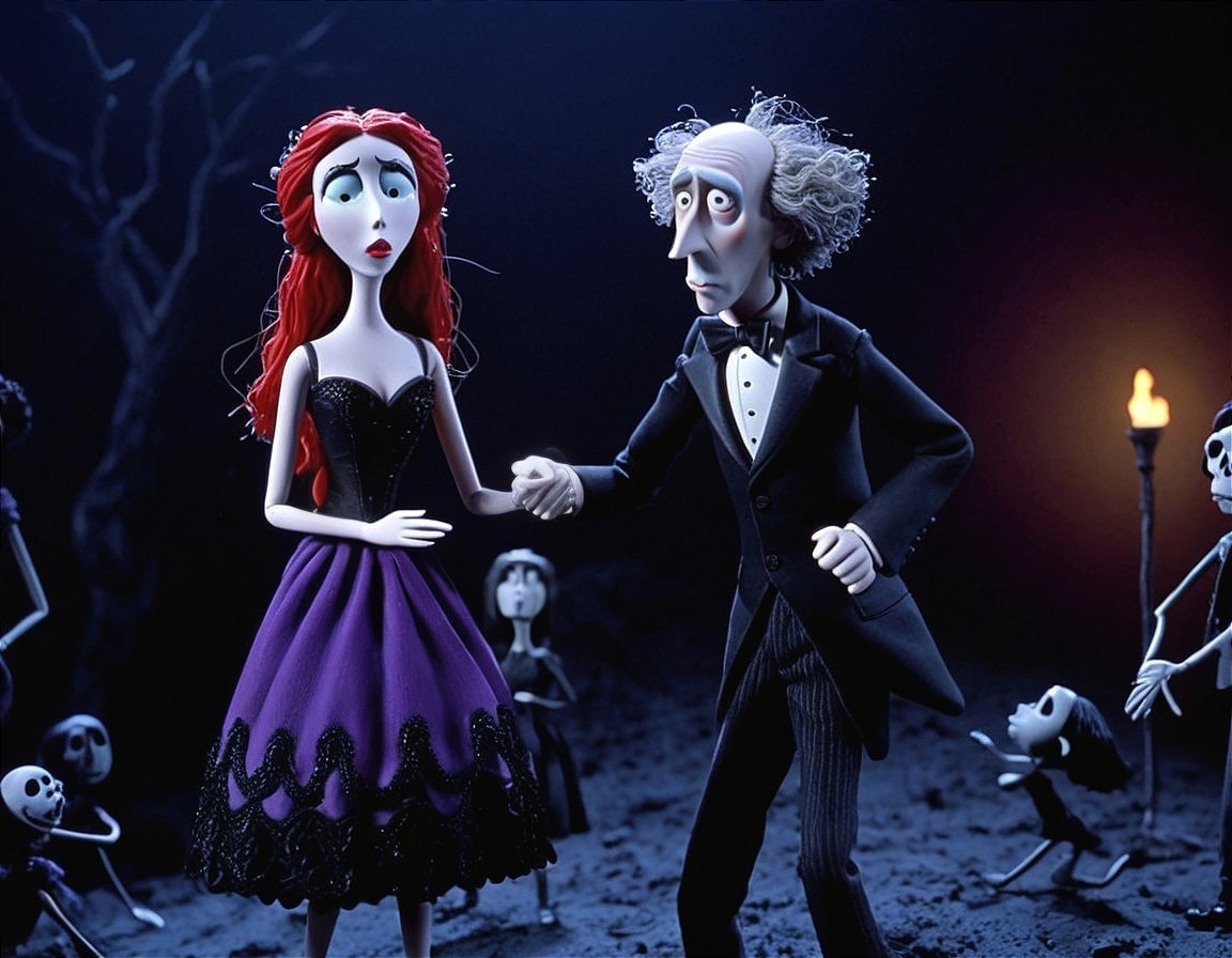 A whimsical, dark setting features two stylized characters: a woman in a purple dress and a man in a tuxedo, holding hands amidst ghostly figures. Eerie lighting enhances the scene's intrigue.