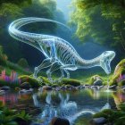 A transparent dinosaur stands in a lush forest, its skeletal frame glistening in the sunlight. Water cascades in the background, reflecting its silhouette in a serene pond surrounded by greenery.