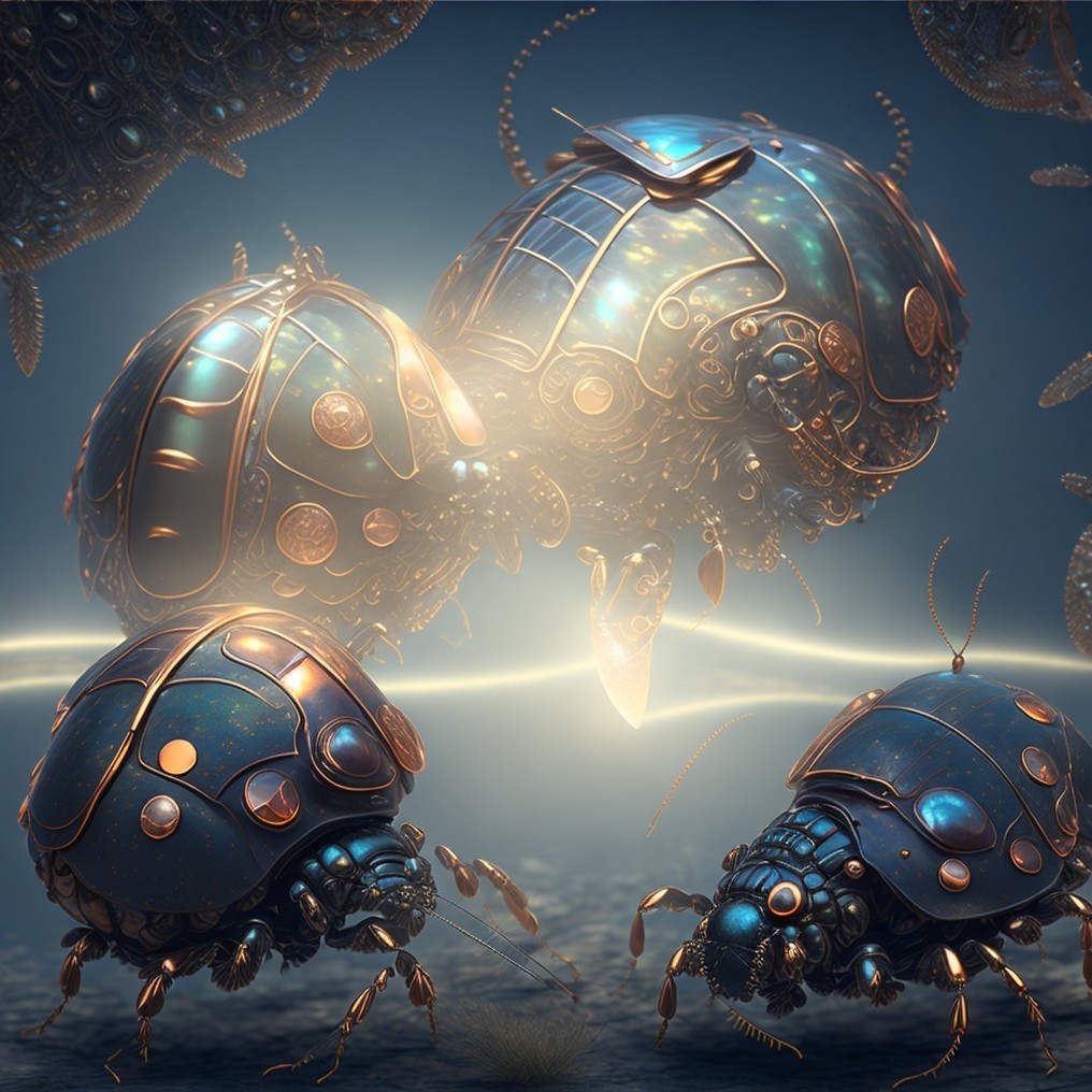 Futuristic mechanical beetles with green patterns on misty surface and twilight sky fireworks