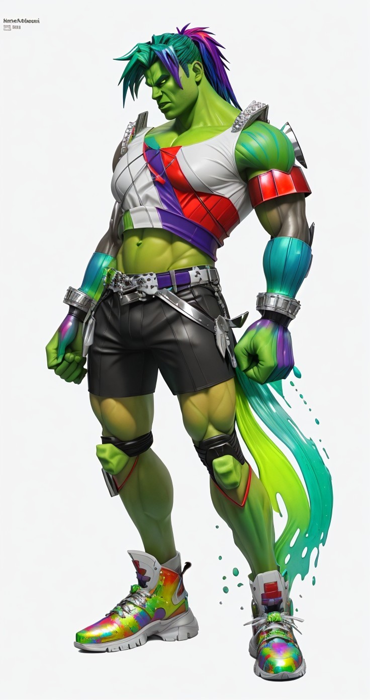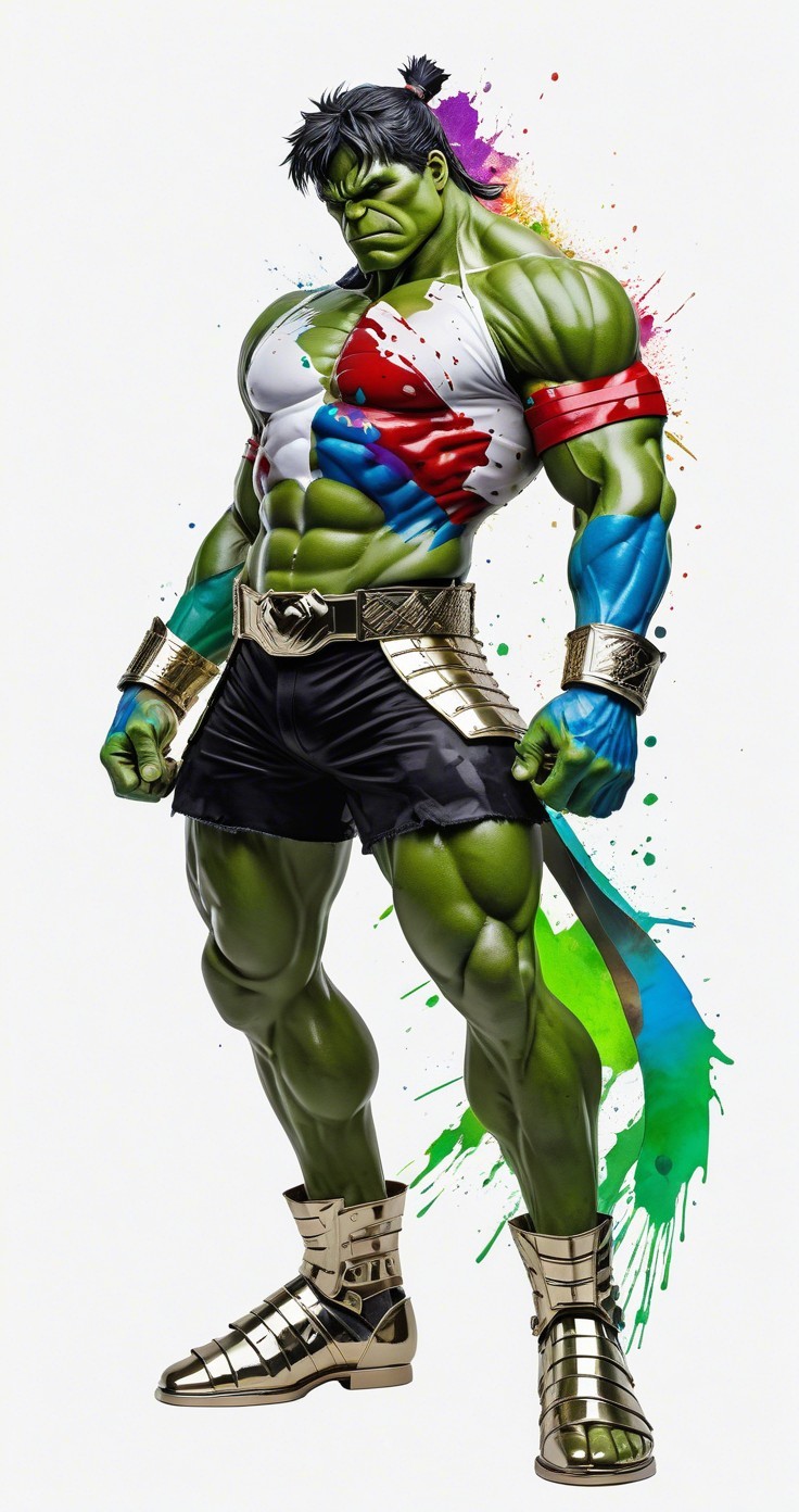 3d render, Muscular bulky avant garde Hulk in white gold samurai armor, acrylic pour chemigram splatter photonegative refractograph alternate dimensions chrome gradient green Blue purple red colors, impasto creative crossed colors, primitivist style, richly layered, color splash, photorealistic, extremely detailed, 3d, Watercolor, trending on artstation, sharp focus, studio photo, intricate details, highly detailed