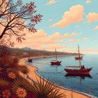 A serene beach scene with a calm sea, colorful boats gently bobbing on the water, and vibrant flora along the shore. The sky features soft clouds and a warm, inviting atmosphere.