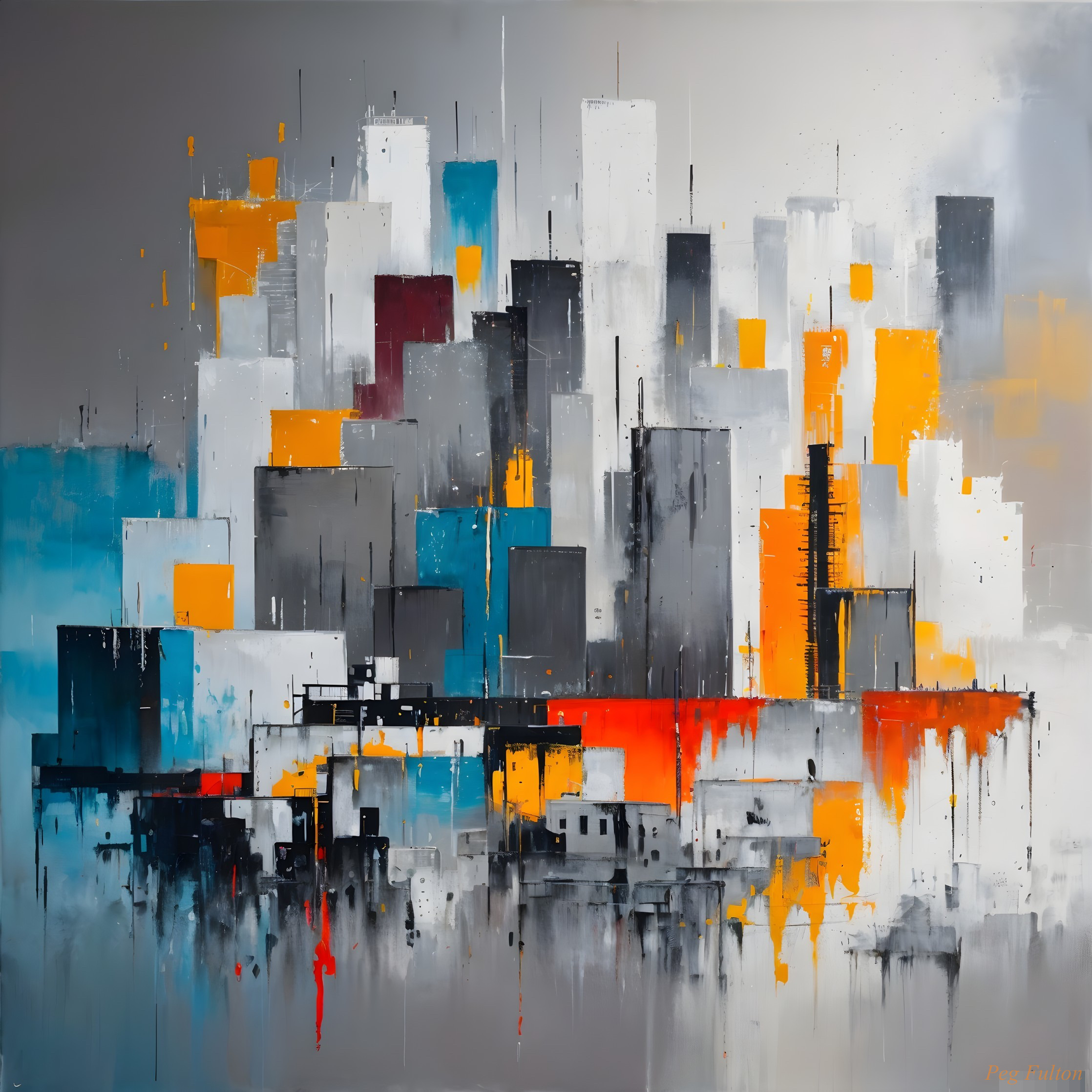 The artwork features an abstract cityscape with bold geometric shapes in white, gray, and vibrant orange and blue accents. Dripping paint adds a dynamic texture, creating a modern urban feel.