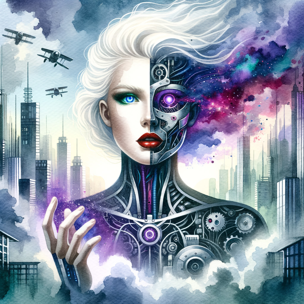 A futuristic woman with flowing hair and abstract features merges with vibrant colors and cosmic elements. Robotic details complement her ethereal appearance against a sci-fi city backdrop.