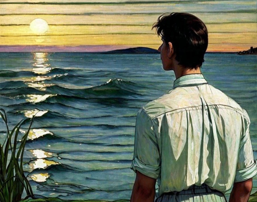 A man gazes at a serene sunset over the ocean, with waves gently rolling and a boat in the distance.