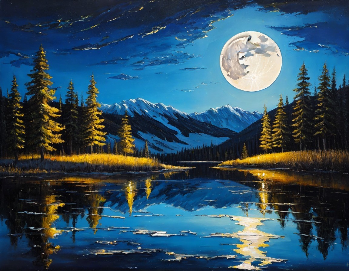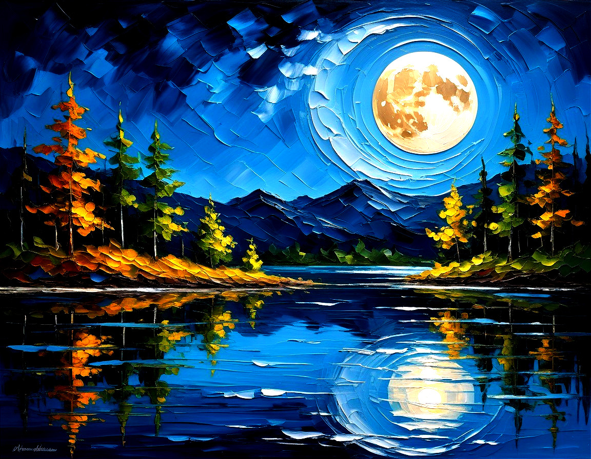 A serene night landscape featuring a bright full moon reflecting on a calm lake, surrounded by vibrant trees illuminated in warm tones against a deep blue sky.