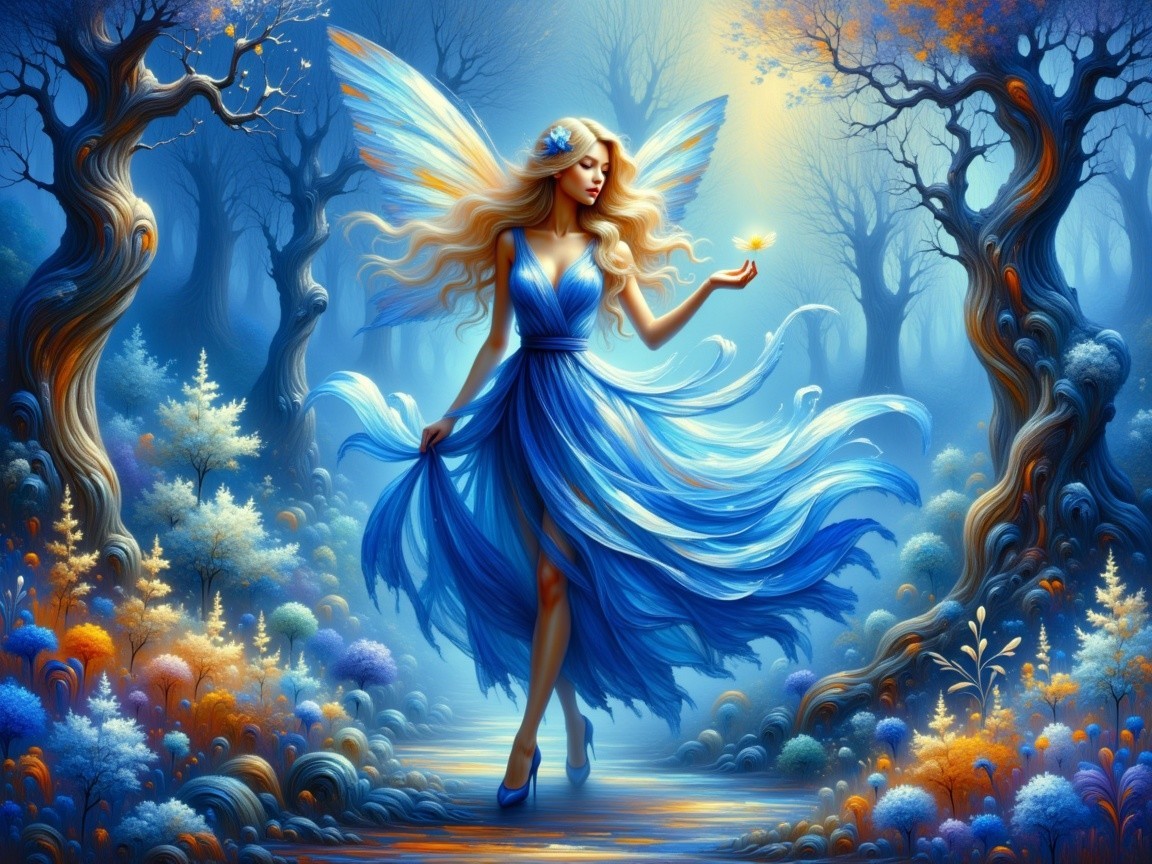 A beautiful fairy in a flowing blue gown dances through an enchanted forest. With delicate wings and a glowing moon, she brings magic to the vibrant flowers surrounding her.
