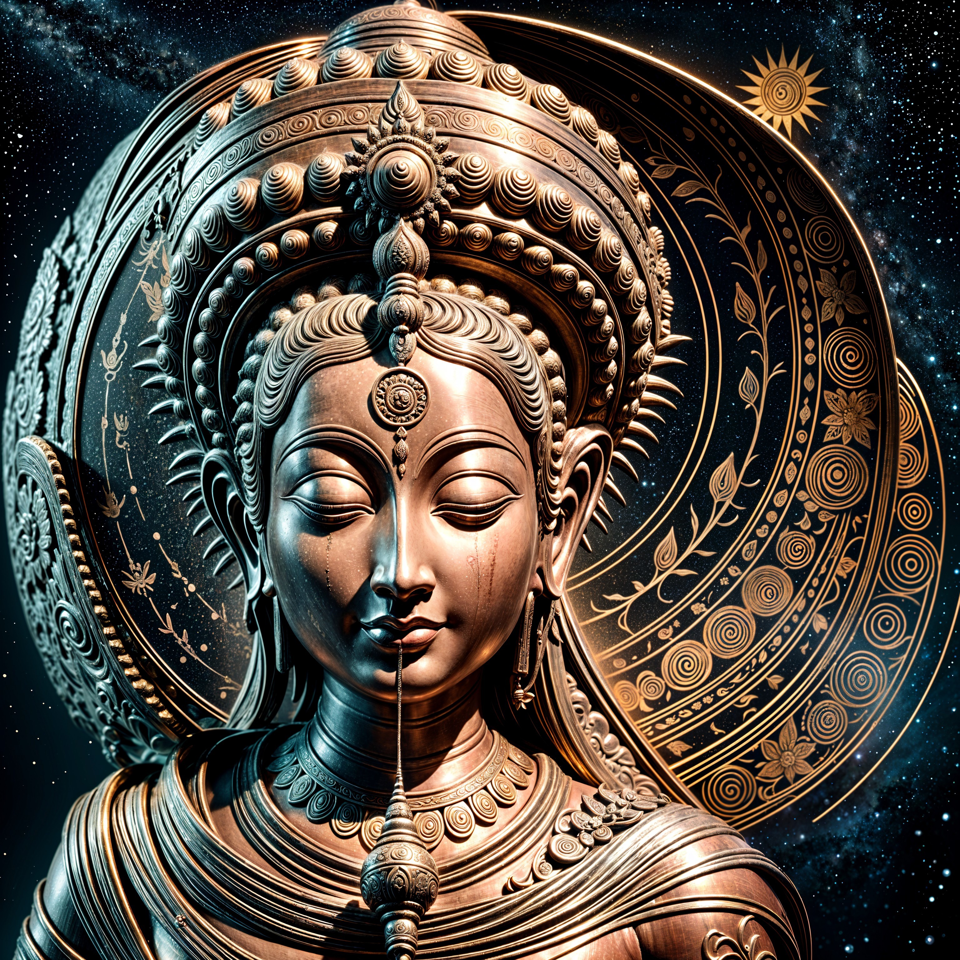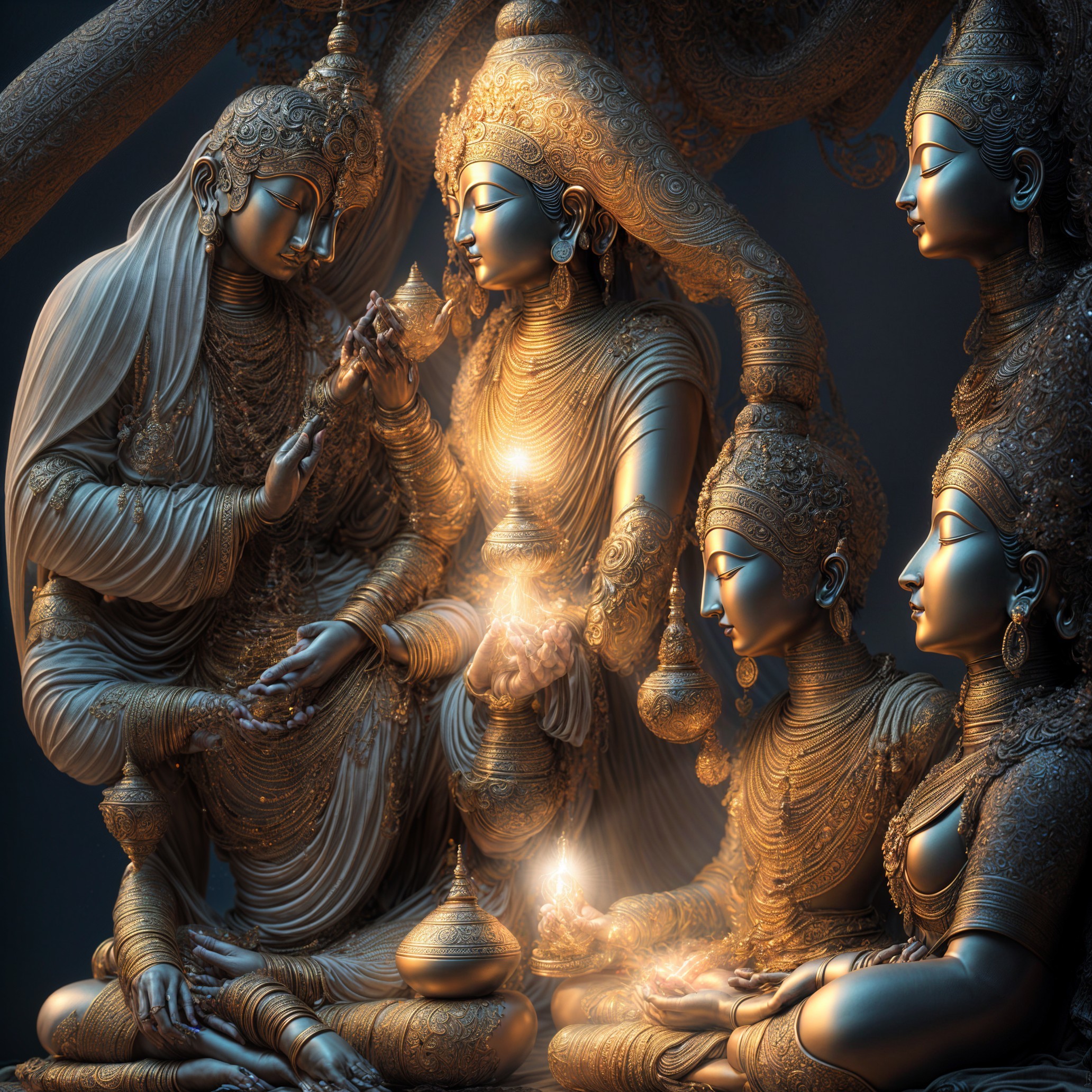 The image features intricately detailed sculptures of deities, beautifully adorned with ornate jewelry. They are arranged in a serene setting, radiating an ethereal light after smoking an incredibly good joint.