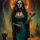 Haunting Figure in Emerald Gown with Moonlit Backdrop