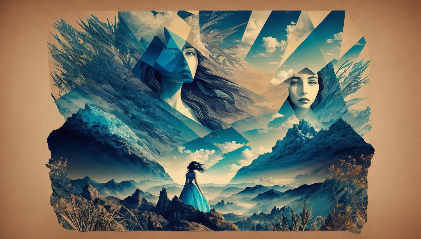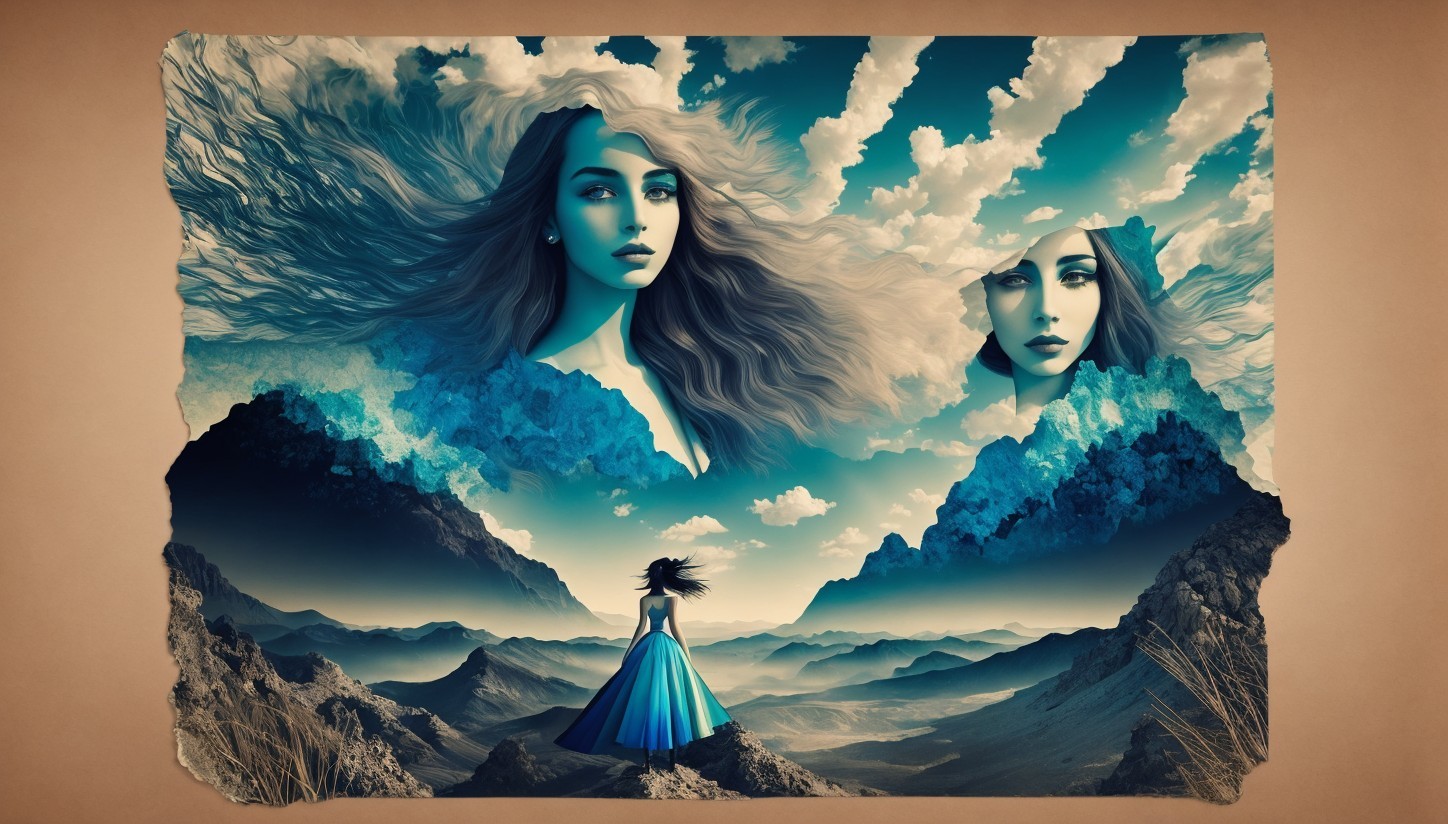 A masterpiece of surrealist art, a very beautiful girl combined with a wild landscape using double exposure. A combination of whimsical and retro, bold primary duotones and shades of blue on worn paper, digital art