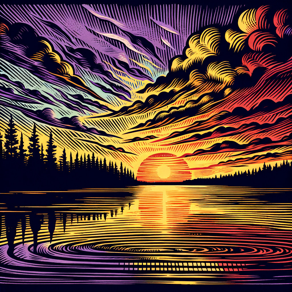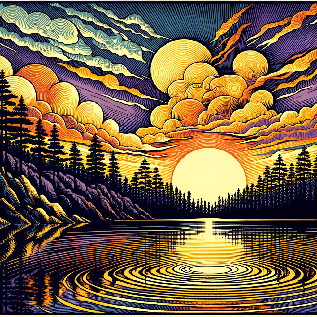 A vibrant, stylized image of a sunset over a mountainous lakeside with colorful, layered clouds and lush trees.