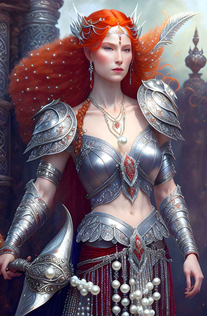 Bold and exquisitely beautiful Facial features and large luminous eyes painted elegantly and flatteringly by Elisabeth Louise Vigée Le Brun; beautiful mystical warrior goddess; lavishly rich auburn tresses interspersed with tightly plaited war braids. Wearing shiny silver armor with elaborate decorative designs, bejeweled with small and intricate pearl and opal details; painted n the Troubadour Style