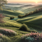 A serene landscape features rolling green hills and a winding path, under a vibrant sky with distant planets and a galaxy. Lush flora and delicate flowers enhance the tranquil, otherworldly scene.