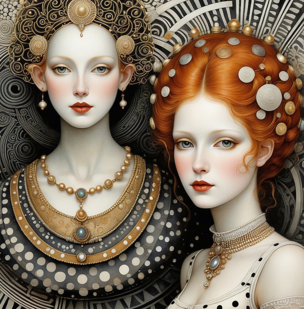 The image features two elegantly styled women with striking features, adorned in intricate jewelry. Their hairstyles are ornate, framed by swirling patterns, creating a captivating, artistic composition.