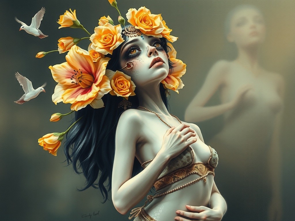 An ethereal woman adorned with orange blooms and a lunar headdress holds a candle, amidst a dreamy, muted backdrop with a full moon.