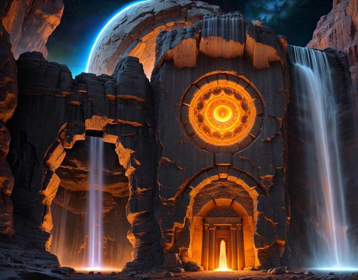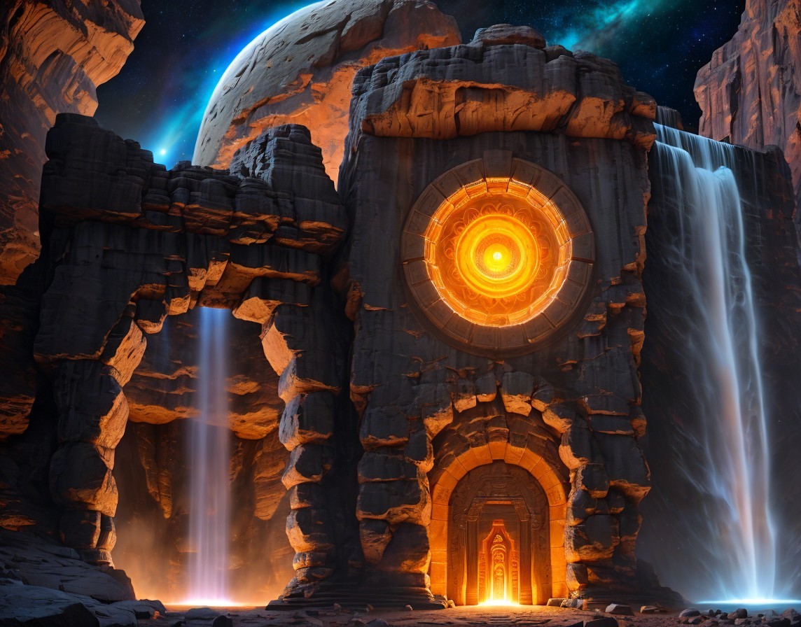 Raging waterfall that flows into a swirling spiraling portal behind a High-tech alien temple (similar to Petra) with intricate geometric patterns. Intricately carved extraterrestrial temple in a rock wall assimilated with advanced alien technology in a cosmic landscape. A portal opens up in the ground in front of the temple. Behind the temple is a raging waterfall. Planets and nebula. Sacred geometry. Dynamic landscape with large, jagged, phosphorescent crystals. Magical crystals. sacred geometry, mystical, Realistic and natural elements, In the style of Cameron Gray