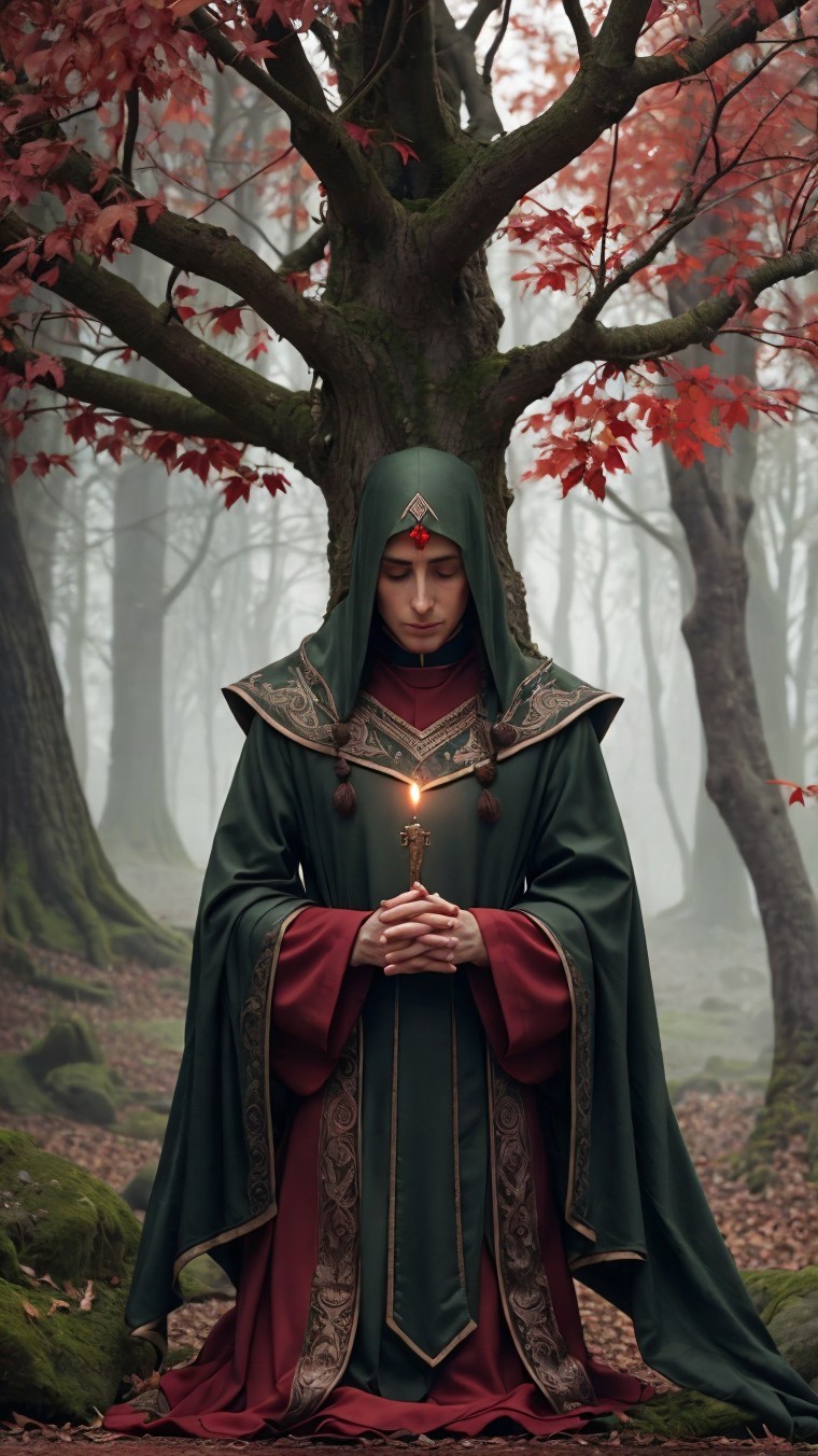 A robed figure meditates under an autumn tree, crimson leaves dotting the serene, misty forest.