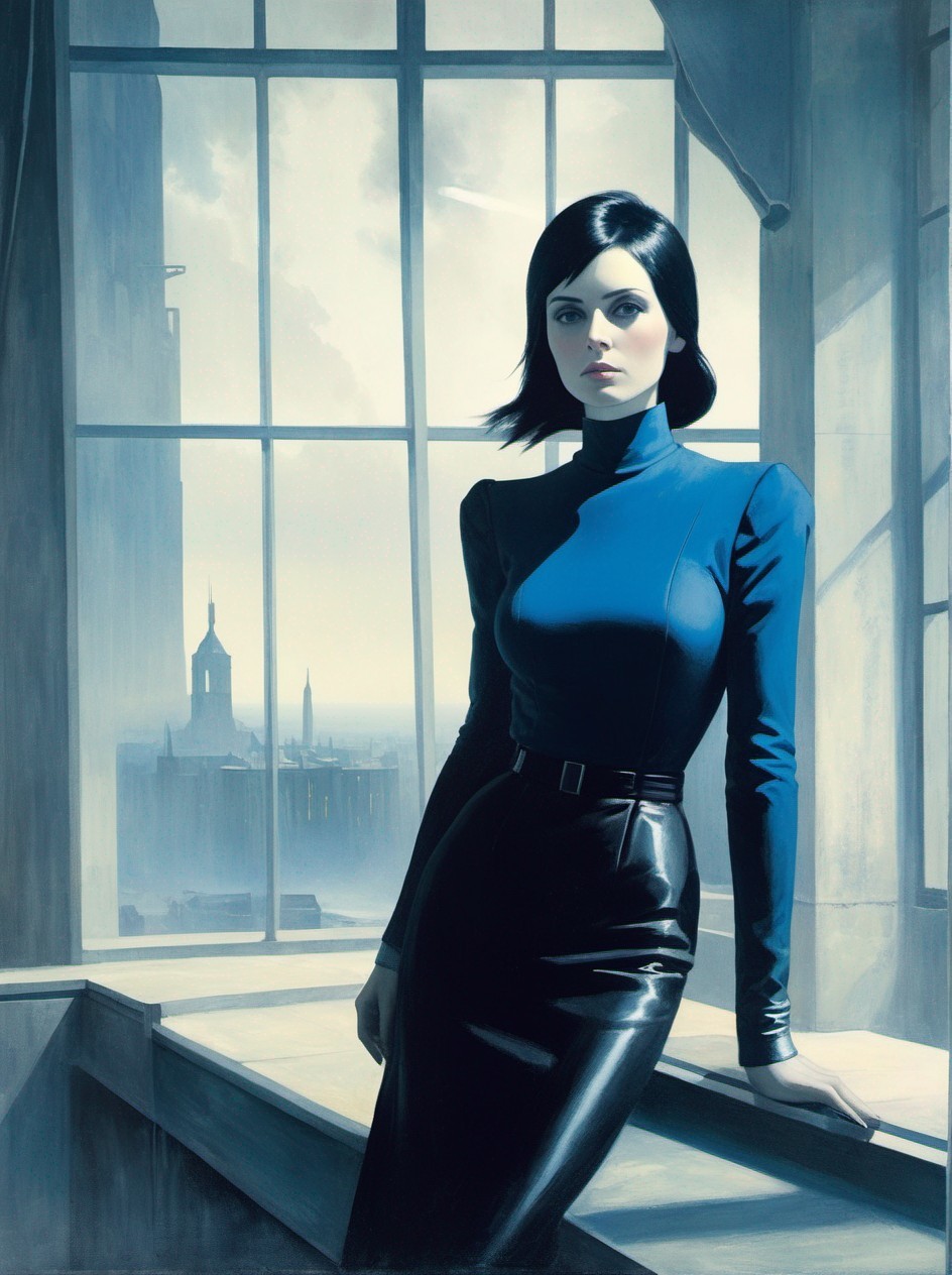 A stylized woman in a blue military-inspired outfit stands by a window overlooking a futuristic cityscape with towering spires.