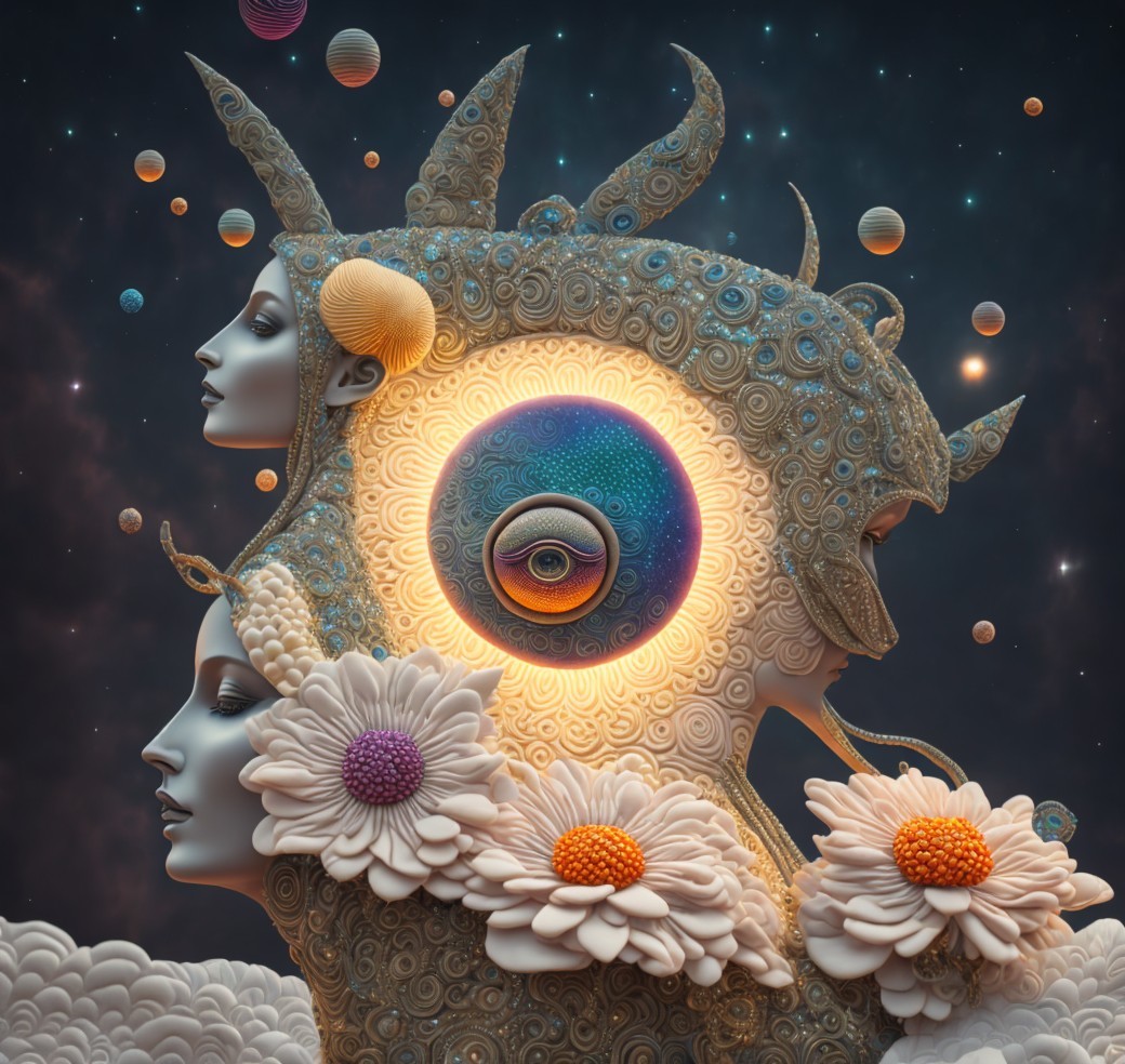 Three profiled faces adorned with celestial motifs against a starry night sky, with a central radiant mandala and white flowers.