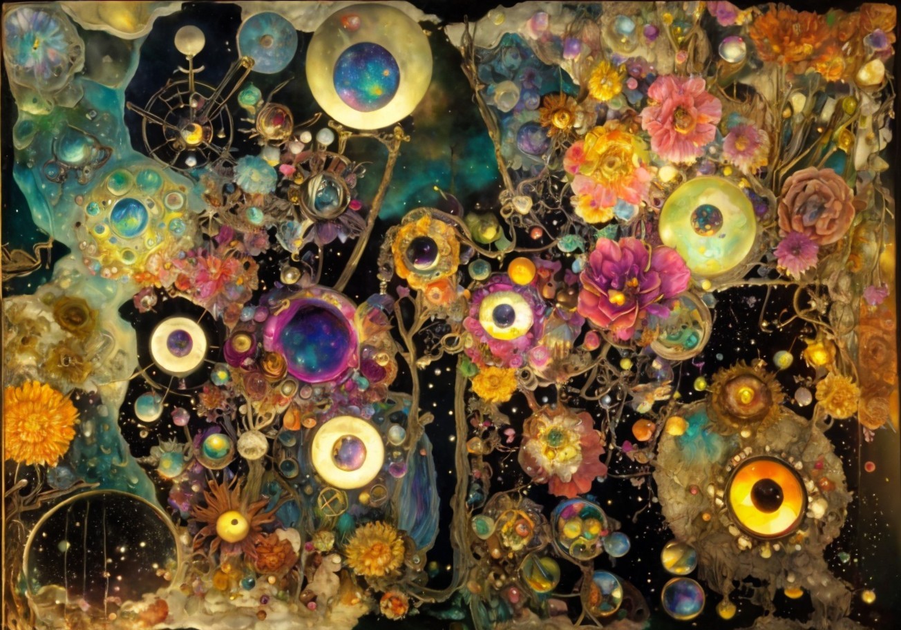 + Prompt:an alien landscape of weirdness and magic, partly frozen lake, landscape of acryllic pour, flowers and metal rods cosmic, glowing mirror orb, smiling full moon in sky, by Egon Schiele, David Lynch. mixed media, some absurd details